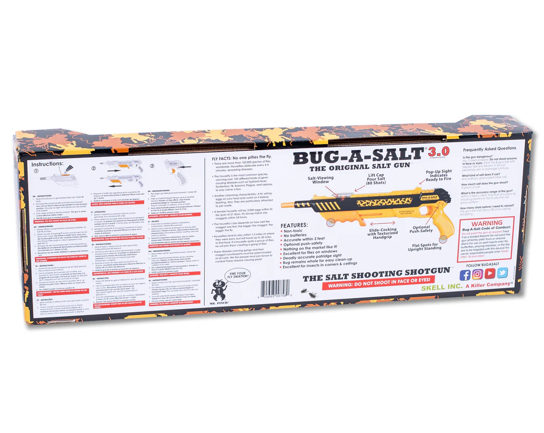 Bug-A-Salt 3.0 Orange Crush je najnovija i najsnažnija verzija omiljene “sačmarice” na sol. Zaboravite na muhomlate i otrovne sprejeve – ovaj uređaj koristi običnu kuhinjsku sol za precizno uklanjanje muha, komaraca i ostalih insekata.